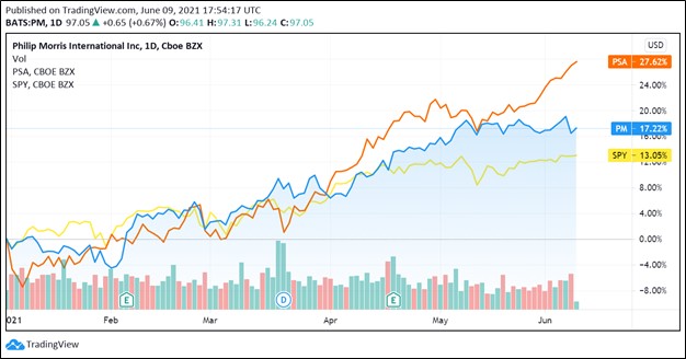 Public Storage (PSA), the self-storage real estate investment trust (‘REIT’) primarily focused on the US, and Philip Morris International Inc (PM), the global tobacco giant behind the Marlboro brand and the IQOS offering, are two of our favorite high-yielding ideas. As one can see in the graphic at the top of this article, shares of PSA and PM have outperformed the S&P 500 (SPY) year-to-date, as of midday trading on June 9, before taking dividend considerations into account. We include both Public Storage and Philip Morris as ideas in the High Yield Dividend Newsletter portfolio.