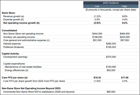 Looking to 2025, Public Storage expects revenue growth in the range of -1.3%-0.8%, with net operating income growth in the range of -2.9%-0.2%. On a consolidated basis, non-same store net operating income is expected to be between $444-$464 million, while ancillary net operating income is expected to be between $198-$203 million. Funds for development openings is targeted at $370 million with maintenance of real estate facilities and energy efficiencies expected at $150 million and $50 million, respectively. Core FFO per share is expected to be between $16.35-$17.00 (below the consensus forecast of $17.18), implying growth of -1.9%-2% on a year-over-year basis. The wildfires in Southern California in early 2025 will negatively impact core FFO for 2025 by $0.23 on both the low-end and high-end of its guidance range.