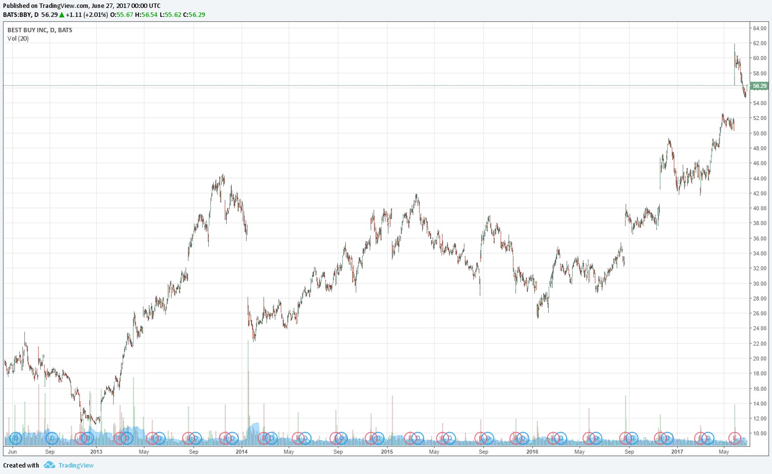 Second, I wanted to bring your attention to the pricing activity of Best Buy (BBY). The company was left for dead near the end of 2013, almost trading for $10 per share, but believe it or not, the electronics retailing big box giant’s shares set a new all-time high a couple weeks ago and have been pulling in a bit to close its gap up after earnings. We highlight Best Buy not because we think its shares are cheap (in fact, we think they are bumping up against the high end of the fair value range), but instead as a reminder that some retailers not only can survive against the onslaught from Amazon, but they also can potentially thrive. CEO of Best Buy Hubert Joly had a lot of positive things to say about its most recent quarter, results released May 22:
