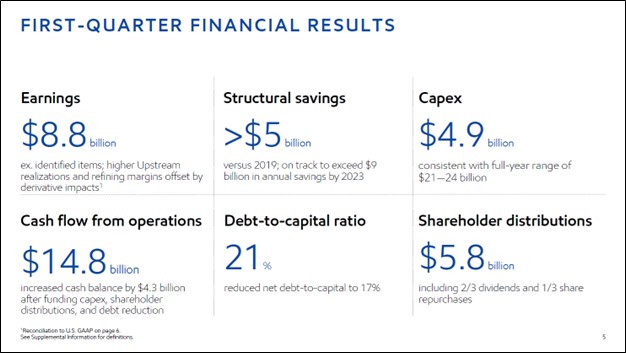 Image Shown: Exxon Mobil is a free cash flow cow in the current raw energy resources pricing environment, aided by its contained capital expenditure expectations. Image Source: Exxon Mobil – 10-Q SEC Filing covering the First Quarter of 2022