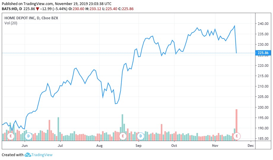 Image Shown: Shares of Home Depot Inc sold off aggressively on November 19 after management reduced the company’s full-year same-store sales and revenue growth guidance for fiscal 2019 during the firm’s third quarter earnings report.
