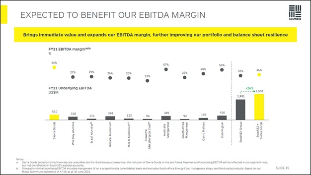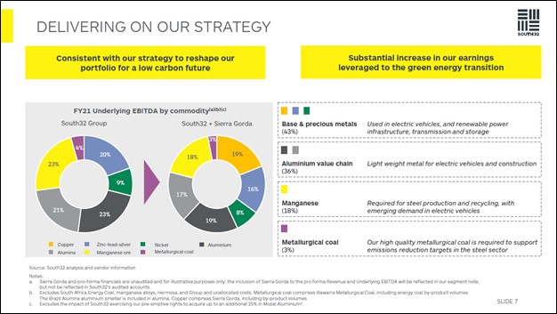 Image Shown: Should the Sierra Gorda acquisition proceed, copper would represent a sizable chunk of South32’s total production volumes and underlying EBITDA generation going forward. Image Source: South32 – October 2021 Sierra Gorda Acquisition IR Presentation