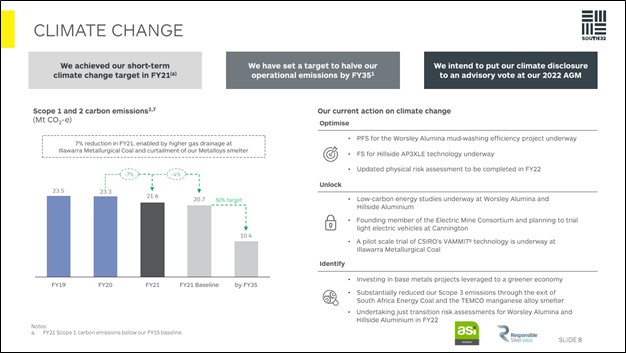 Image Shown: South32 is committed to cutting its operational emissions in half by FY2035 using FY2021 as a baseline and has already made meaningful progress on this front in recent fiscal years. Image Source: South32 – FY2021 Financial Results Presentation