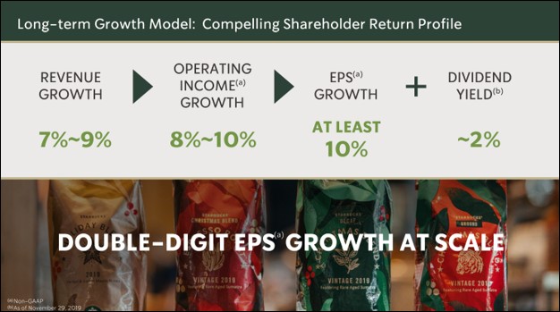 Image Shown: Starbucks is targeting for high-single-digit, at the midpoint, annual growth in its revenue and operating income. That is expected to result in EPS growth of at least 10% per year, which will be made easier via share buybacks. Image Source: Starbucks – December 2019 IR Presentation