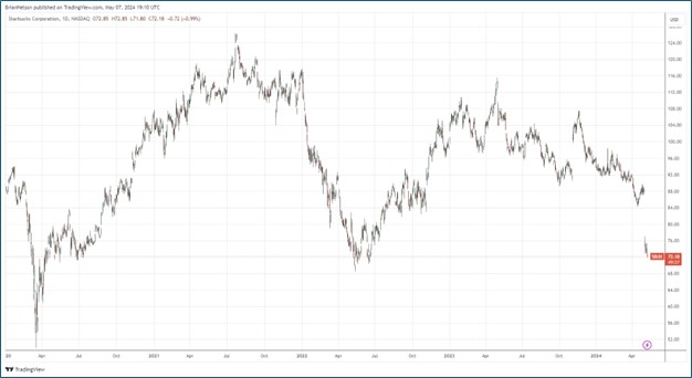 Looking to the full year of 2024, Starbucks noted on its conference call that global revenue growth is now expected to be in the low-single-digit range, down from prior guidance of 7%-10%. Starbucks also cut its full-year U.S. comparable store sales growth expectation to the range of low-single-digit to flat versus prior expectations of 4%-6%. We’re steering clear of Starbucks as a cautious consumer spending environment and execution remain key issues for the firm. We prefer Domino’s (DPZ) and Chipotle (CMG) instead.