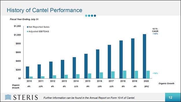 Image Shown: Cantel Medical has grown like clockwork, more or less, over the past decade. Image Source: Steris – Steris Acquiring Cantel Medical IR Presentation