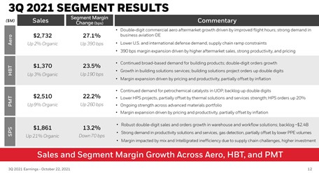 The third quarter was another strong one for Honeywell, with sales growth in all four segments, significant margin expansion, and exceptional execution even as we faced tough challenges in the supply chain environment. Organic sales grew 8%, led by 38% growth in Aerospace commercial aftermarket, 21% growth in Safety and Productivity Solutions, and 29% growth in UOP and 14% growth in advanced materials within Performance Materials and Technologies. Our focus on operational and commercial excellence enabled us to expand segment margin by 130 basis points to 21.2%, exceeding the high end of our guidance range by 60 basis points. As a result, we delivered adjusted earnings per share of $2.02, up 29% year over year, achieving the high end of our third-quarter guidance range. Our cash performance was strong, and we remain on track to meet our cash flow commitments for the year. We continued to execute on our capital deployment strategy, repurchasing $0.7 billion in shares, announcing our 12th dividend increase in the past 11 years, and completing the acquisition of Performix Inc. to expand our portfolio of automation solutions for the life sciences industry.