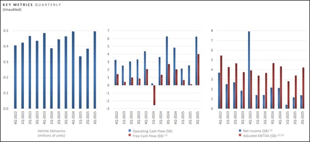 On October 22, Tesla (TSLA) reported mixed third quarter results, with revenue beating the consensus forecast, but non-GAAP earnings per share missing expectations. Total revenue increased 12%, to $28.1 billion, but total gross profit increased a modest 1%, as its GAAP gross margin was squeezed 185 basis points in the period. Income from operations came in at $1.6 billion, which dropped 40% year-over-year, as its operating margin fell 501 basis points. Adjusted EBITDA fell 9% with its adjusted EBITDA margin dropping 348 basis points. Non-GAAP net income fell 29%, while non-GAAP earnings per share fell 31% in the quarter.