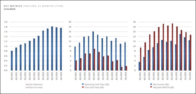 Image: Tesla’s trailing twelve-month performance across vehicle deliveries, operating and free cash flow, as well as adjusted EBITDA have faced pressure in recent quarters.