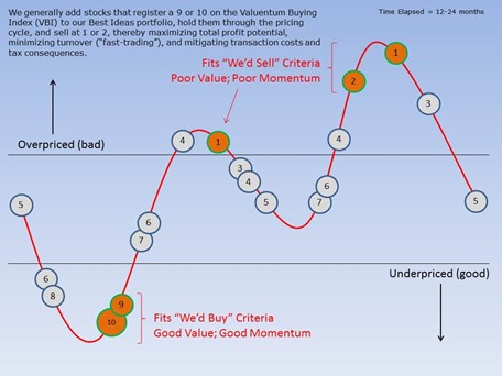 An examination of the process shows why there may be low VBI ratings in the newsletter portfolios. After all, holding a stock from when it registers a 10 to when it registers a 7 truncates performance, much like holding an undervalued stock until it first encounters the fair value estimate range limits returns that may come from continued momentum. In a perfect market, which it is far from, we would like to add 9s and 10s and hold them until they register 1s and 2s.