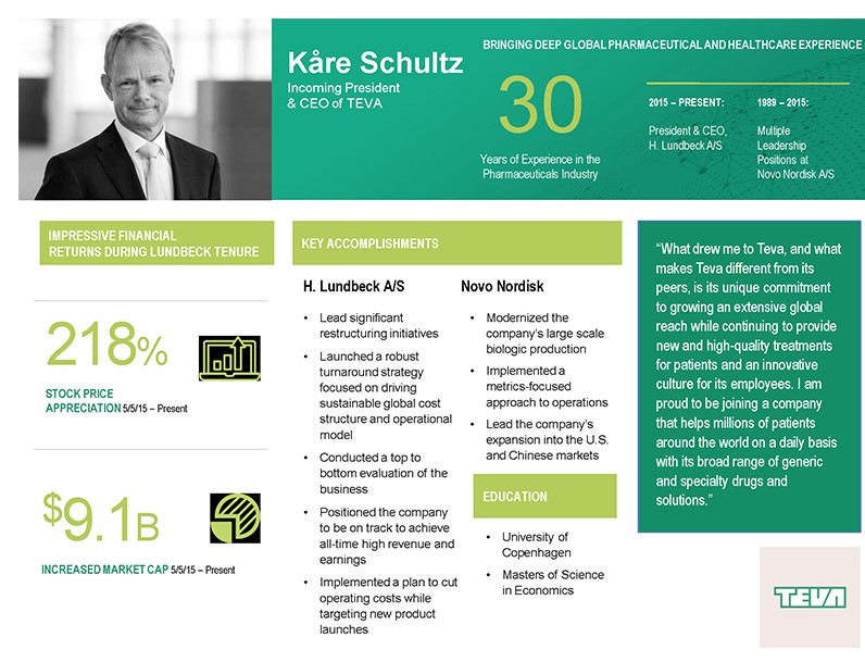 Schultz has earned a bit of a reputation for aggressive cost-cutting from his recent stint at Lundbeck, a desperately needed skill as TEVA is close to violating its debt covenants. We feel his background is well suited for the challenge that Teva poses in its current state—a view the board of Teva appears to agree with; hence the upfront payment of $20 million with an overall pay package worth 52 million dollars.