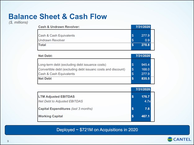 From the end of fiscal 2019 to the end of fiscal 2020, Cantel Medicals’ net debt load grew by ~$0.6 billion (inclusive of short-term debt and convertible debt) reaching ~$0.8 billion at the end of July 31, 2020. Cantel Medical also has operating lease liabilities on the books to be aware of (~$0.05 billion when including short- and long-term operating lease liabilities).