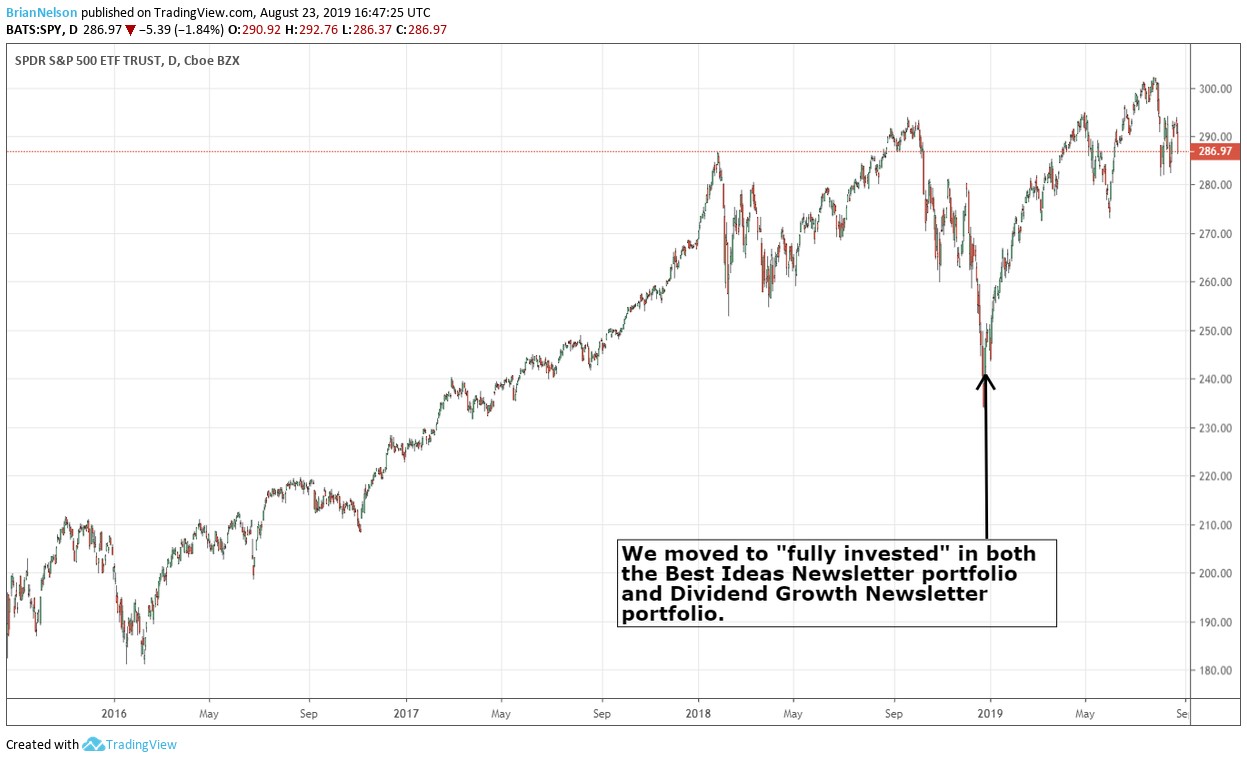 Shares of Apple (AAPL), Nike (NKE) and Caterpillar (CAT) sold off aggressively on the news. It seems like China is not backing down anytime soon, and we get the sense that the country will put tremendous pressure on American agriculture and autos, if continually pushed by the White House. We’re not making any moves in the Dividend Growth Newsletter portfolio or Best Ideas Newsletter portfolio at this time. We’re available for any questions.