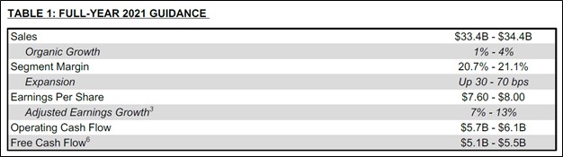 Honeywell’s guidance for 2021 can be viewed in the upcoming graphic down below. Please note the firm expects to generate $5.1-$5.5 billion in free cash flow this year.