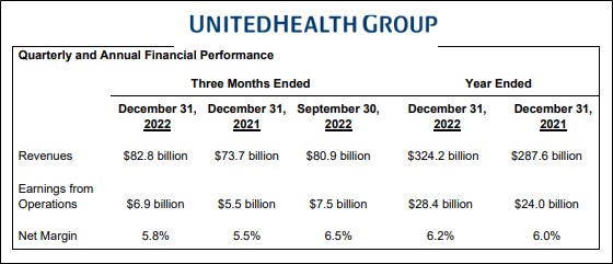 At its UnitedHealthcare division, which provides health benefits to individuals and employers as well as Medicare and Medicaid beneficiaries, revenue advanced 12% during the year, as earnings from operations expanded to $14.4 billion from $12 billion in 2021, as the segment’s operating margin advanced ~0.4 percentage points, to 5.8%. At its Optum division, which is the company’s care management, pharmacy services and information and analytics segment, revenue grew 17% in 2022, while earnings from operations advanced to $14.1 billion from $12 billion last year, as its operating margin held relatively steady at 7.7%. On a consolidated basis cash and short- and long-term investments were $71.6 billion at the end of 2022, while long-term debt and short-term borrowings came in at $57.6 billion.