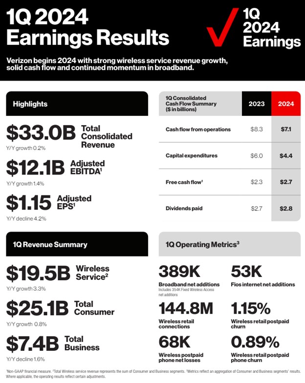 On April 22, Verizon (VZ) reported mixed first-quarter results. During the period, total operating revenue grew a modest 0.2% thanks in part to pricing actions, to $33 billion, while consolidated net income fell to $4.7 billion from $5 billion in the year-ago period. Adjusted earnings per share came in at $1.15, which compares to $1.20 in last year’s quarter.