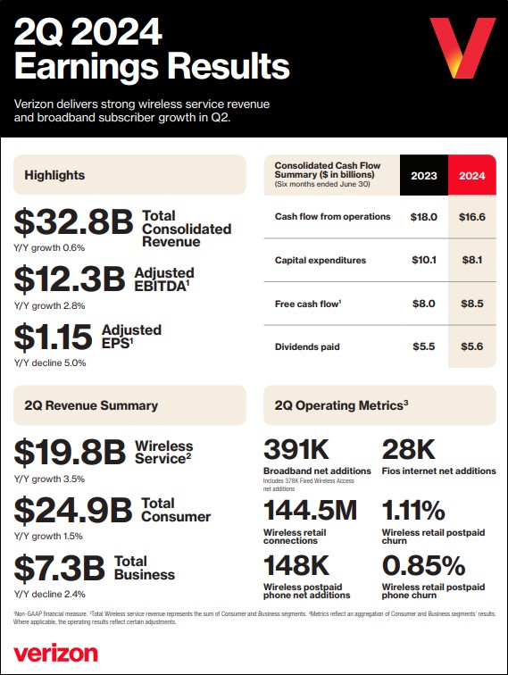 Verizon’s First Half 2024 Operating Cash Flow Declines, Adjusted Earnings Fall