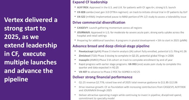 Vertex delivered a strong start to 2025 with notable execution across the business as we grow and diversify the revenue base, progress multiple launches and advance the R&D pipeline. We continued to expand our leadership in CF and build global momentum for CASGEVY, and we launched JOURNAVX in moderate-to-severe acute pain. With multiple programs in pivotal development including povetacicept, which continues to make rapid progress in achieving its potential as a pipeline-in-a-product, and additional programs in early and mid-stage development, Vertex is poised to continue to deliver value for years to come.