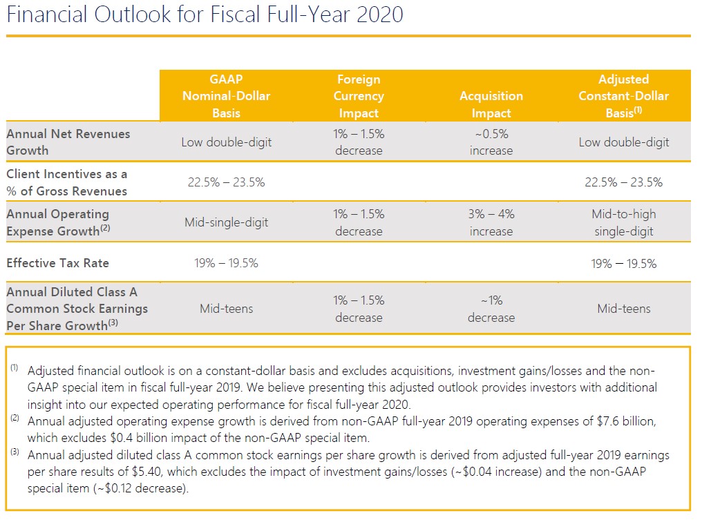 Going forward, Visa is targeting material top-line growth and managed operating expense growth on an annual basis. Adjusted revenue growth is expected in the low double-digit range this fiscal year, while adjusted operating expense growth is expected in the mid-to-high single-digit range. That implies Visa is expecting modest/meaningful adjusted operating margin expansion in fiscal 2020, but we caution that due to elevated renewal activity, client incentives as a percent of gross revenue is expected to increase year-over-year in fiscal 2020.