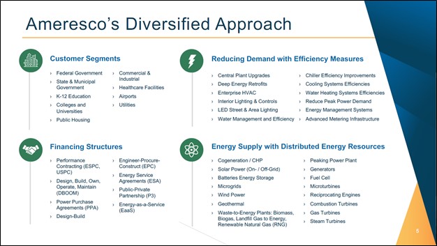 Image Shown: An overview of Ameresco’s expansive slate of energy efficiency and green energy solutions, and the various financing structures it offers its customers. Image Source: Ameresco – August 2021 IR Presentation