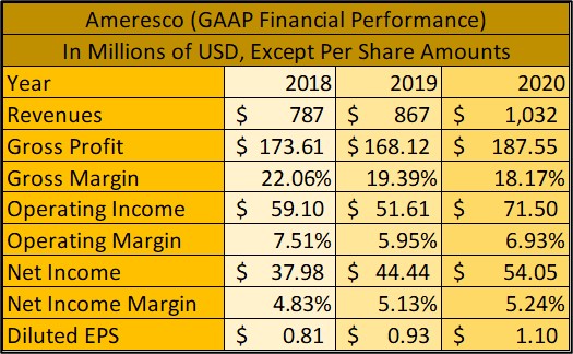 Ameresco has put up tremendous growth over the past several years. The company’s GAAP revenues grew 31% from 2018 to 2020 while its GAAP operating income climbed higher 21% during this period. Please note that Ameresco’s outstanding diluted share count grew by almost 5% during this period due primarily to stock-based compensation and the firm’s preference to invest in the business, as compared to buying back its stock. In the upcoming graphic down below, we highlight Ameresco’s GAAP financial performance from 2018 to 2020.
