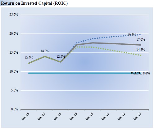 United Rentals’ ability to successfully integrate new acquisitions into its own operations has been key, as the company is a prolific acquirer and utilizes scale to enhance its margins. Targeting growth in specialty rental markets such as pump solutions, tool solutions, trench safety, and power & HVAC is expected to continue driving United Rentals’ margins higher (we forecast that the company’s operating margins will expand by over 300 basis points in 2019 versus 2017 levels). Down below is a visual representation of how these endeavors are impacting United Rentals’ expected ROIC ex-goodwill, from our 16-page Stock Report covering United Rentals that can be accessed on its ticker page.