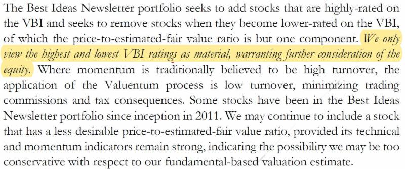 As it relates to the Best Ideas Newsletter portfolio, for example, if a stock registers a 9 or 10 on the Valuentum Buying Index in our coverage universe, we would consider adding it to the newsletter portfolio. When the stock then/eventually registers a 1 or 2 on the Valuentum Buying Index in time, we might then consider removing it from the newsletter portfolio. The changes in the “big middle” of the Valuentum Buying Index (including 8-rated stocks) offer more tactical considerations, but we generally only consider the highest and lowest VBI ratings to be material. During times of market froth, however, as in arguably today’s environment, in the Best Ideas Newsletter portfolio, we may relax some of the VBI criteria and consider undervalued stocks with neutral technical/momentum indicators, or fairly valued stocks with good relative valuation metrics and strong technical/momentum indicators. We may only consider removing ideas from the simulated newsletter portfolios when both their valuation and technical/momentum indicators point in the same direction (good/good or poor/poor), or if we’re making more strategic/tactical moves.