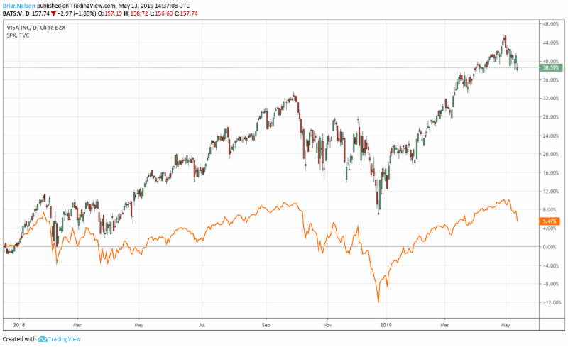 Image: Visa (V) has been the top-weighted idea in the Best Ideas Newsletter for as long as we can remember. In December 2017, when we migrated to weighting ranges for ideas in the newsletter portfolio, the company’s “weight” was 8.6%. The image above shows its performance relative to the S&P 500 (SPY) since then. Source (pdf).