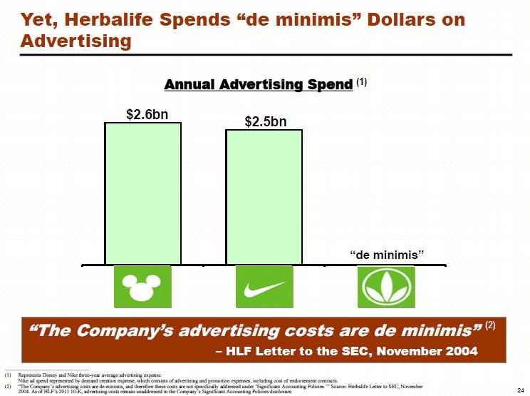 Still, that doesn’t mean that we totally buy the bull case for Herbalife. Ackman publishes an entire website stating his bear argument, most of which centers on the fact that Herbalife inappropriately delivers delusions of grandeur when people sign up to become distributors. It is also curious, to us, that Herbalife does minimal advertising and compares itself to the likes of Disney (click ticker for report: ) and Nike (click ticker for report: ), as shown below.