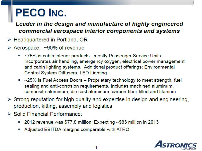 Undoubtedly, the deal could be transformative for Astronics considering Peco is expected to generate approximately $83 million in revenue during 2013. For perspective, Astronics did $266 million in sales in 2012, so the deal is quite significant. CEO Peter Gundermann noted that EBITDA margins are similar to those at Astronics (~20%), so we’re pegging EBITDA at approximately $16.6 million. Effectively, the company paid 8x EBITDA for the company, and there are natural synergies that could work to make the deal even more accretive to earnings.