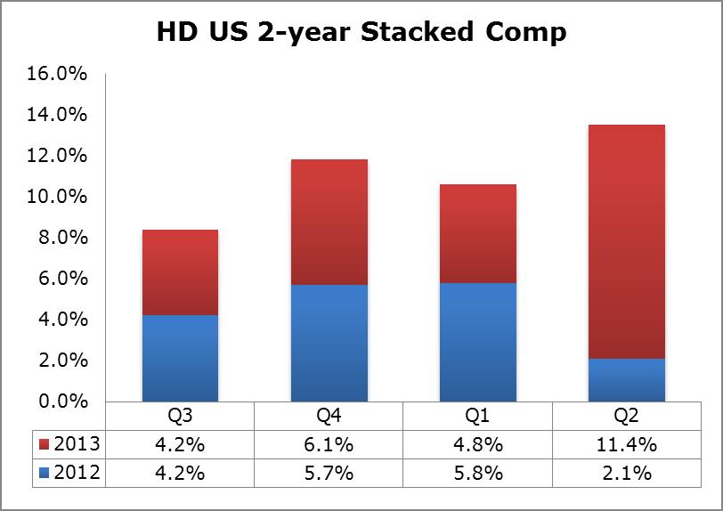 Same-store sales expansion at Home Depot during the second quarter was fantastic, as total same-store sales jumped 10.7% year-over-year driven by an 11.4% growth rate in the US. Some sales of weather-sensitive goods were pushed into the second quarter due to the cool temperatures in the first quarter, but the trend is still overwhelmingly positive, in our view. The housing recovery continued through the beginning of August.