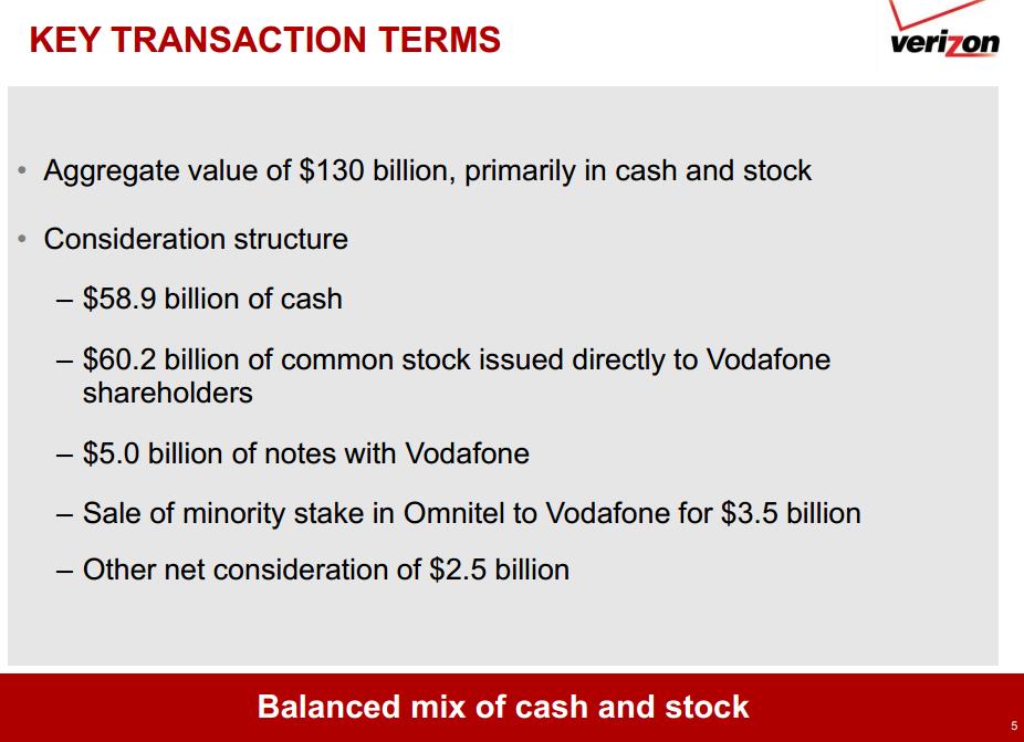 Even for a cash cow like Verizon, a $130 billion deal is a lot to stomach. Details of the financing reveal just how complex a deal this large must be. Verizon will issue $60.2 billion worth of stock to existing Vodafone shareholders, equal to more than 30% of the float. The $58.9 billion worth of cash will come in the form of a $61 billion Bridge Credit Agreement with JP Morgan, Barclay’s, Bank of America, and Morgan Stanley, but Verizon intends to replace the agreement with bond issuances. The balance will be paid with notes payable to Vodafone and the sale of Omnitel to Vodafone for $3.5 billion.