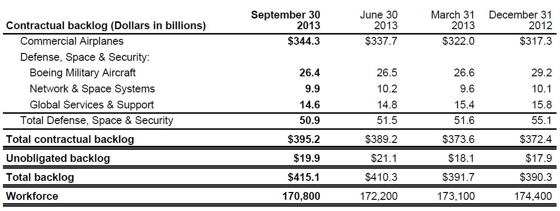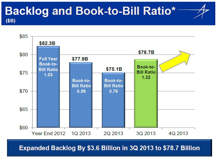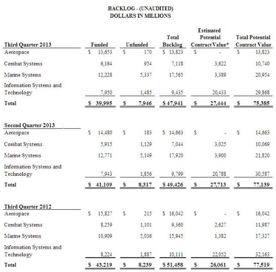 Total backlog at the end of third-quarter 2013 was $47.9 billion (was $51.5 billion in year-ago period), and the estimated potential contract value was an additional $27.4 billion ($26.1 billion in year-ago period), representing management’s estimate of value in unfunded indefinite delivery, indefinite quantity (IDIQ) contracts and unexercised options. Total potential contract value, the sum of all backlog components, was $75.4 billion (was $77.5 billion in year-ago period) at the end of the quarter.