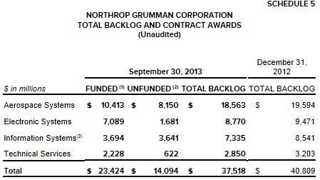 As of September 30, 2013, total backlog was $37.5 billion compared with $40.8 billion as of Dec. 31, 2012. Third quarter 2013 new awards totaled $5.9 billion and book-to-bill was 97 percent. The decline in backlog is primarily due to reduced and delayed customer awards resulting from the current U.S. government budget environment as well as Information Systems backlog adjustments of $1 billion primarily to reduce unfunded backlog for expired periods of performance on active contracts.
