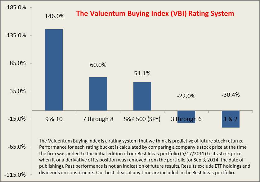 The latest iteration of the performance, dated September 3, 2014, continues to showcase the strong sorting mechanism embedded within the investing framework, particularly when the index is coupled with qualitative oversight and portfolio management skill. Sorting winners from losers is what the Valuentum Buying Index has been designed to do, and its application as both an avenue for idea generation and as an overlay to assign weightings within the portfolio-management setting has become ever-more apparent with continued usage.