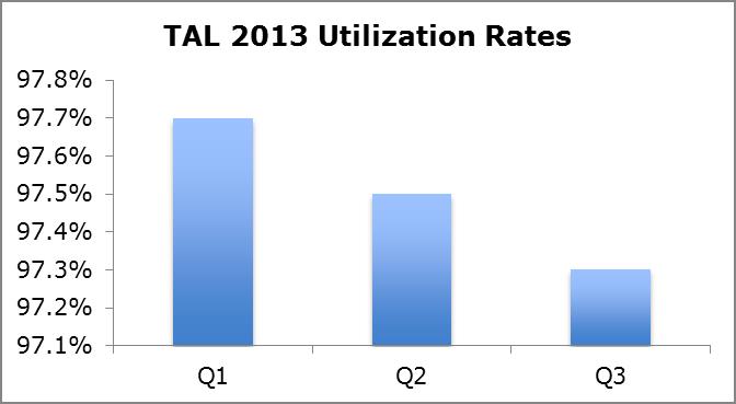 In spite of what TAL identified as a relatively weak market, utilization rates were above 97% compared to the industry average of the low-to mid-90% range. However, management noted that current utilization rates are hovering at 96.9%, which means that rates are on track to decline in every quarter of 2013 (on a sequential basis). This trend certainly doesn’t bode well for a highly-leveraged company that cites high utilization rates as a competitive advantage.