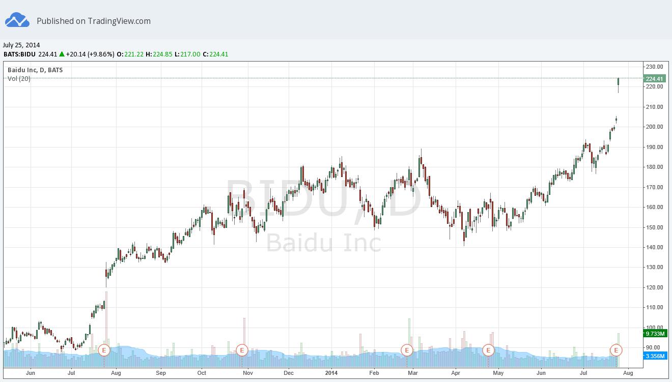 On Thursday, the Chinese Internet search giant reported excellent second-quarter results. Total revenue surged an impressive 58.5% from the same period a year ago, while operating profit advanced 22.5%. Baidu has a clear lead in mobile in China, with mobile revenue now as much as 30% of total revenue. Net income attributable to Baidu leapt more than 34%, to $571.7 million. The growth rates were fantastic, and we think Baidu is now trading more consistently with its blockbuster performance than previously. In quarters past, Baidu would tend to sell off on such results. The market, in our view, has finally accepted that Baidu has significantly more earnings power than had been embedded in its share price just a number of months ago—earnings growth potential is far greater than the 20%+ growth rate reported in the second quarter (especially once investments slow). The resetting of earnings-growth expectations by the market is largely responsible for the ~10% share-price pop during the trading session Friday.