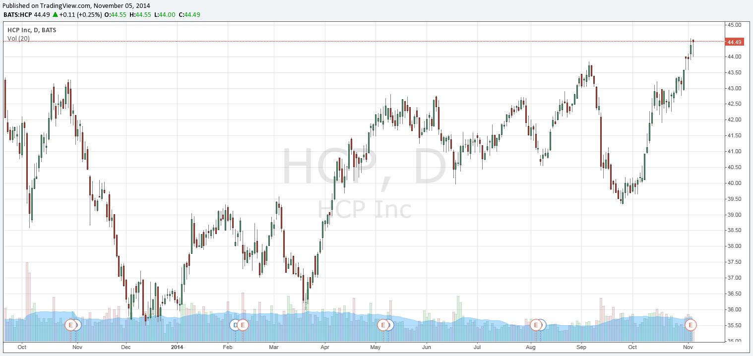 From a technical standpoint, HCP looks really good here (November 5, 2014). We recently added this gem to the Dividend Growth portfolio.
