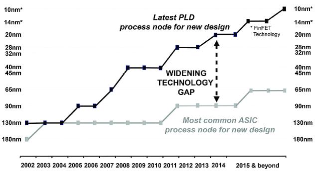 We like Altera’s competitive position to win new business and its existing partnership with Intel, which should smooth deal integration. In fact, Altera’s management will tell you that its partnership with Intel has given it an upper hand in addressing performance, power consumption, and cost at the same time, while rivals have struggled with each sequentially. From what we can tell, this has given Altera an early-mover advantage, even relative to its chief FPGA rival Xilinx (XLNX), and the growing “process technology gap” for new designs between PLDs (FPGAs) and the ASIC alternative is revealing. Even if Altera doesn’t sustain such an advantage relative to technology-savvy peers, the benefits of FPGAs over ASICs should generate a market large enough for a number of players.