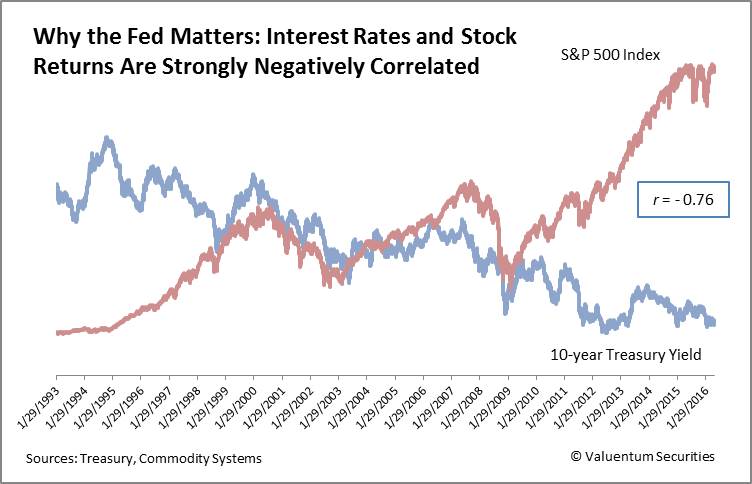 I’ve welcomed the idea of not putting too much weight in near-term macro trends, much like that of the school of Buffett, but where I do spend particularly close attention to macro dynamics is in the case of “outlier-type” events like that of the Financial Crisis in 2008/9 or in the case of the existing environment today, where valuations on S&P 500 stocks are stretched, “Soros, Icahn, Nelson Hedge for Market Fall (May 2016),” and the market is staring down the onset of contractionary monetary policy, which while easy to dismiss as mere headline noise, is very important. When it comes to almighty interest rates, they are a key focal point in stock valuation analysis (i.e. a key driver behind intrinsic value) and by extension potential stock returns. The value of future free cash flows generated 10 or 15 years in the future, for example, is substantially more in an interest rate environment of near-0% than one of, let’s say, 5% or 10%. Interest rates matter to stock valuations – and historical data analysis implies a very strong negative correlation between rates and stock returns in part because of this very reason.