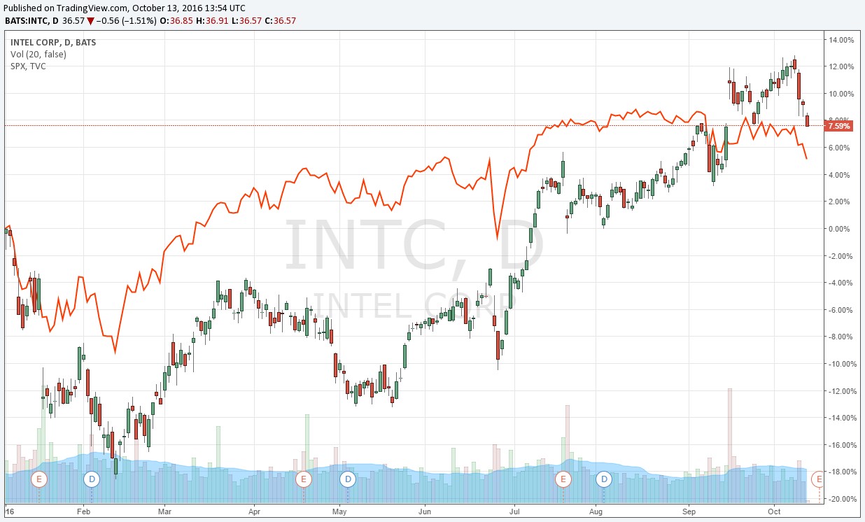 Well, it didn’t take long for me to start worrying that I made a mistake with this one. A lackluster fourth-quarter 2015 report sent shares of Intel below the broader S&P 500 (SPY) market return, as shown in the image above. I was encouraged by unconfirmed reports in March that Intel won a portion of Apple’s iPhone 7 baseband modem orders, but the company was still trailing the index by several points even then. In April, I brought to light the very interesting dichotomy of how many consumer staples entities like Coca-Cola (KO) are trading at lofty unadjusted earnings, despite reported revenue falling, while Intel, which many peg as a tech dinosaur, was actually experiencing revenue growth, “Did You Know: Coca-Cola is Shrinking: Intel Is Growing? (April 2016).”