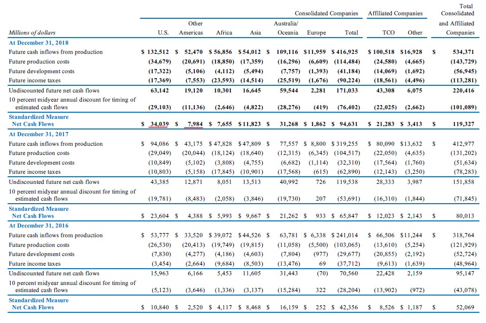 Effectively, it appears Chevron is writing down its entire unconventional upstream Appalachian investment or the vast majority of it. Down below, note the ‘Standardized Measure Net Cash Flows’ figure related to Chevron’s proved oil and gas reserves in the ‘US’ and ‘Other Americas’ regions. In short, this measure is Chevron’s forecast for future asset-level free cash flows discounted at a rate of 10% based on strip pricing near the time the forecast is made. Please note that this latest impairment charge represents a large slice of Chevron’s expected future discounted asset-level free cash flows from the region (based on the forecasts made within its 2018 Annual Report).