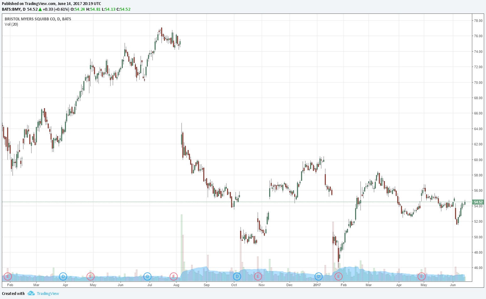 Bristol-Myers Squibb (BMY) was the darling of the 2013 ASCO event, revealing stunning data for its flagship compound Opdivo. The equity took off leading into and well after the conference, beginning 2013 at roughly $33 per share. The shares zoomed higher as Bristol started to realize the potential of Opdivo. Bristol’s share price peaked north of $75 per share in July of 2016 for a stellar return well in excess of the overall market. Even though Bristol is often lumped together as a traditional pharma company, the equity returns were more biotechesque.