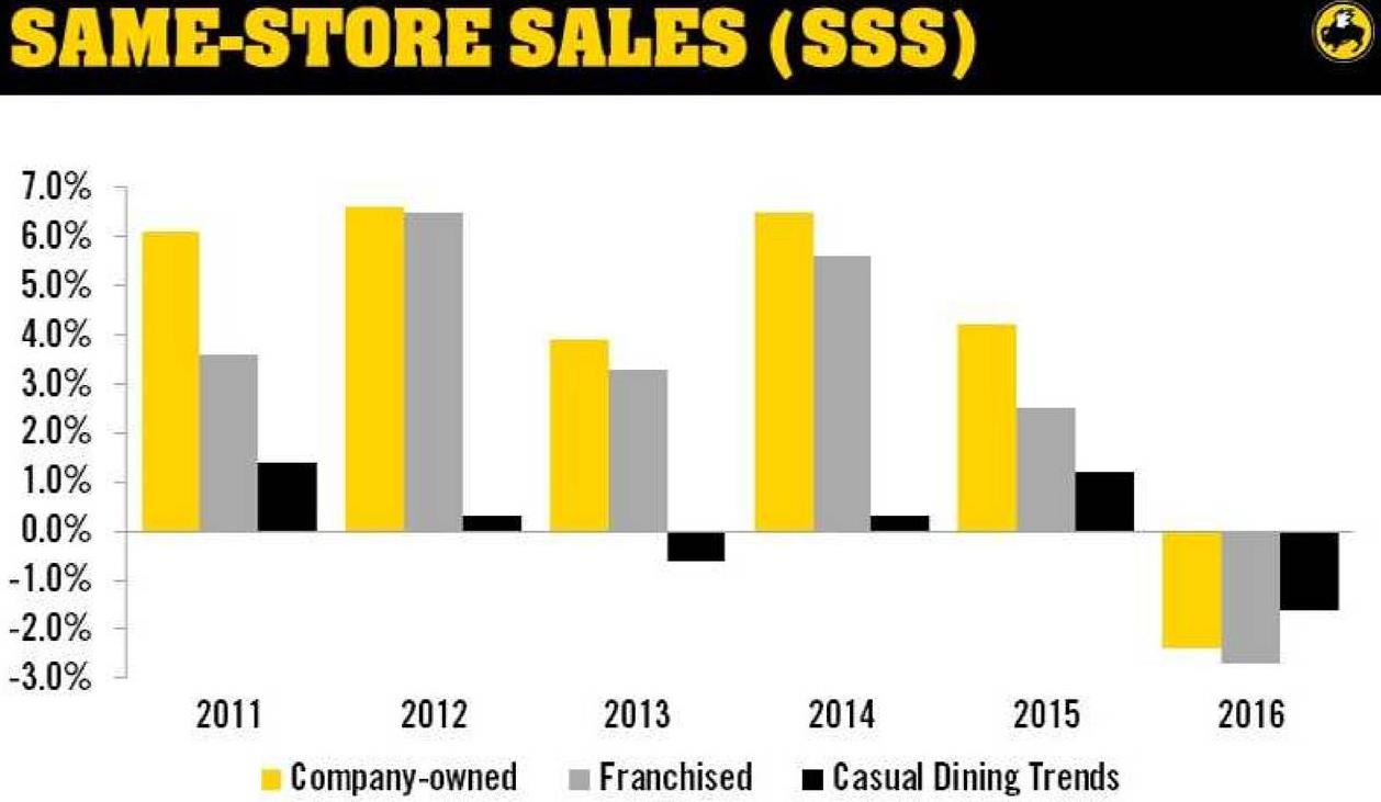 Management has also tagged its “Blazin’ Rewards” loyalty program as a driver of long-term same-store sales growth, and the team stated it plans to roll out the program systemwide in the second quarter of 2017. The company seems to expect similar results to the “Up to +2% lift in test stores,” but no specific metric or comparison was offered for the 2% lift it is expecting. What’s more concerning about the loyalty program is the fact that management is still hyping it at all. In the company’s 2014 Analyst Day, a stated goal was the launch of a system-wide loyalty program in 2015. The progress of the roll-out has been a complete disappointment, from where we stand, and such developments are the basis for the undressing of management from Marcato Capital.