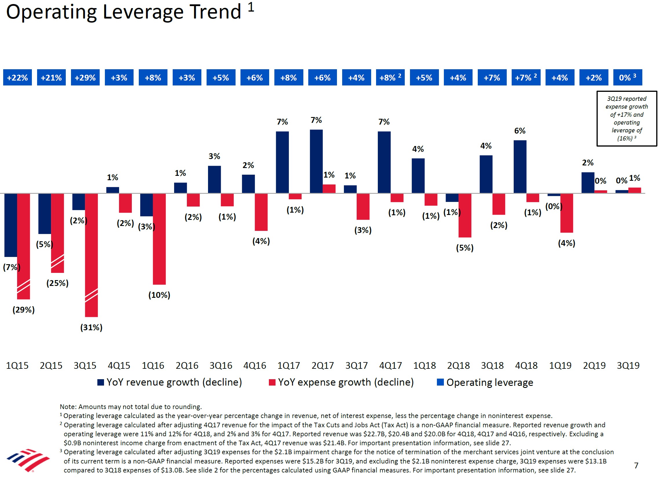 Total revenue was flat compared to last year while adjusted net income was up 4% and adjusted diluted EPS was up 14%. The firm’s share count fell 8% year over year thanks to its massive share buyback program. The bank’s efficiency ratio came in flat at 57%, while its return on tangible common shareholders’ equity was an impressive 15.6%. After 18 quarters of positive operating leverage, Bank of America just barely missed extending that streak to 19 quarters. We would characterize cost control as solid, nonetheless. The bank’s capital levels remained robust with a common equity Tier 1 ratio of 11.4%, the same as this time last year.