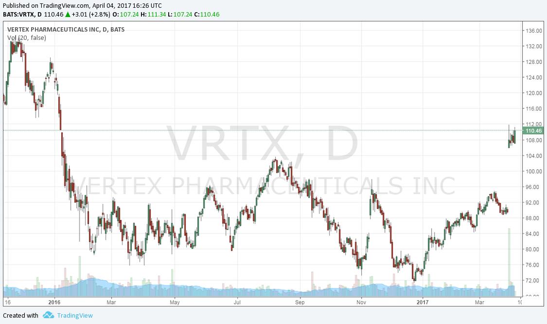 Shares of Vertex jumped nearly 20% on the positive results of Tezacaftor/Ivacaftor. We feel the run up may be overdone, and we continue to watch shares. Mainly, we are put off by the near $27 billion dollar market cap of the company and weak near-term earnings visibility.