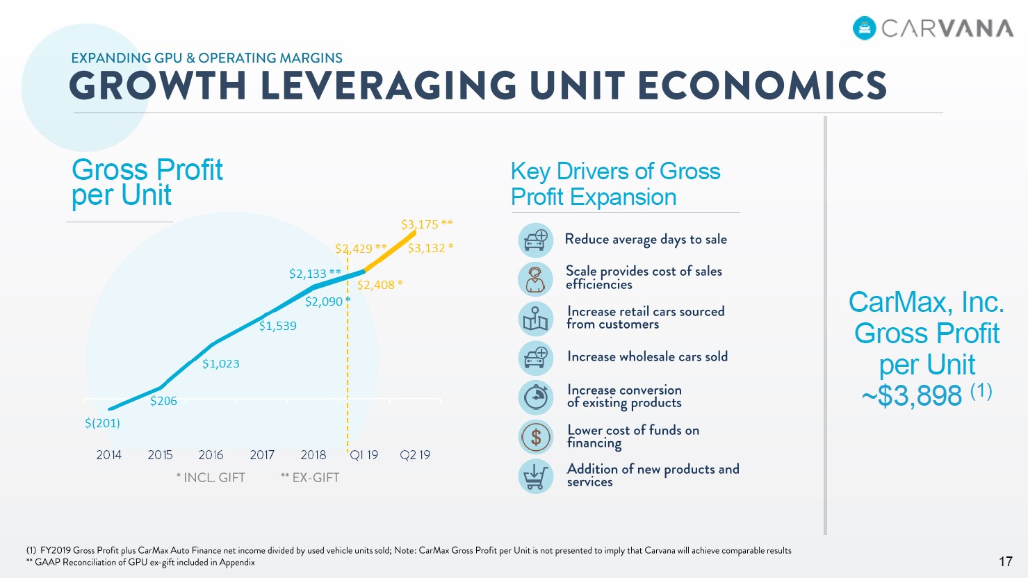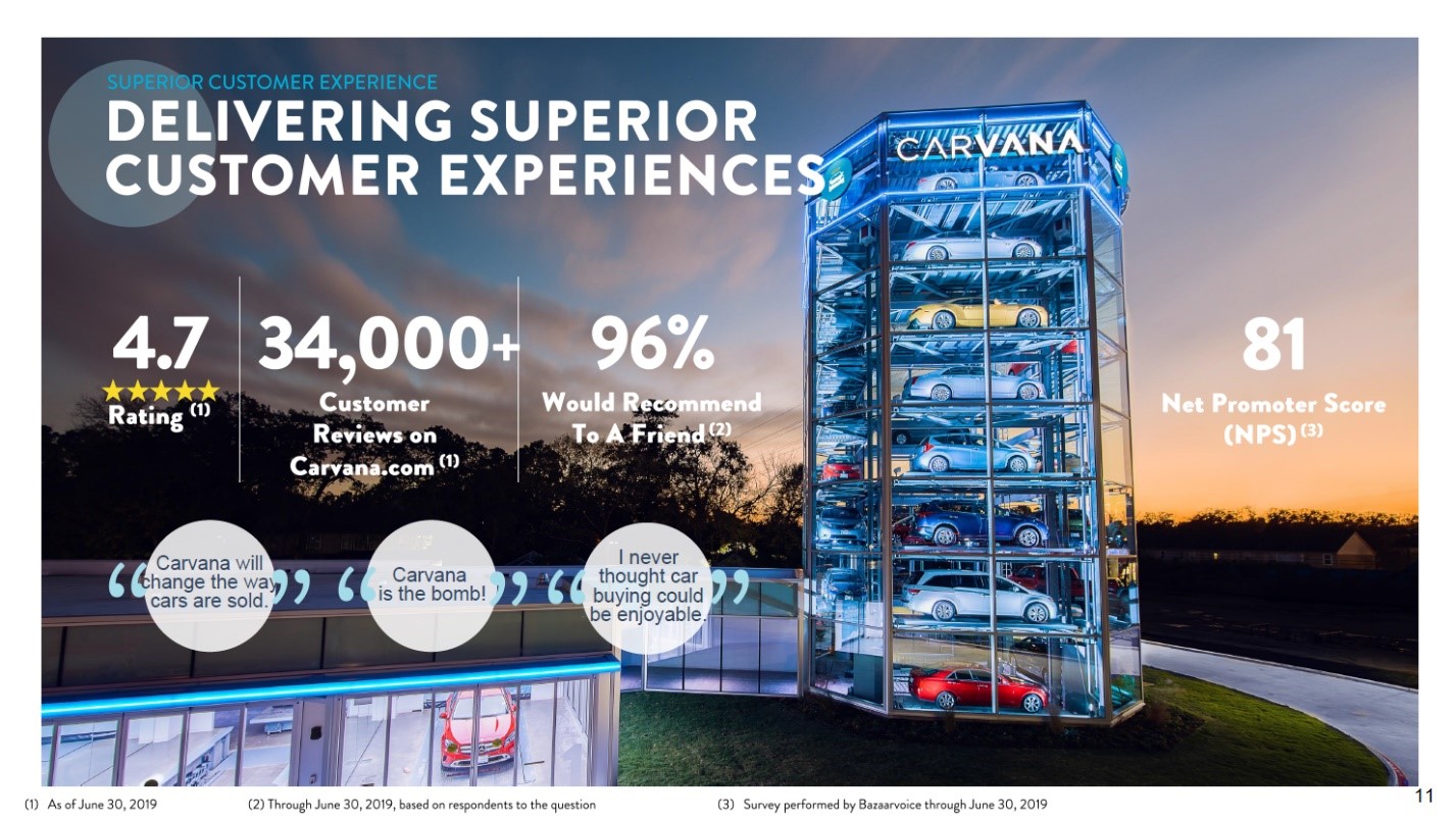 Carvana in many ways seeks to democratize the used automobile market by ensuring a standard level of ranking, quality and inspection services are provided across all different types of automobiles. The company leverages 21st century solutions to fix 20th century problems as consumers are able to “research and identify a vehicle, inspect it using interactive high definition photography, obtain financing and warranty coverage, value their trade-in, complete their purchase and schedule delivery or pick up, all from our online platform” with employees delivering those vehicles via “branded haulers as soon as the next day.” Additionally, please note that these sales are backed by a seven-day return policy, which is something many used auto dealerships wouldn’t want to offer.