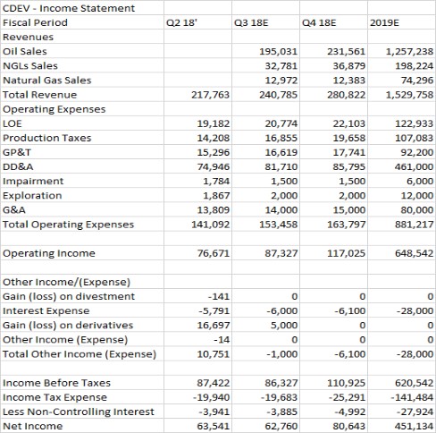Centennial Resource generated $311.4 million in adjusted operating cash flow during the first half of 2018, which doesn’t take into account working capital changes (which were positive during that period). Note that Centennial Resource plans on spending roughly $970 million this year on capital expenditures. Exhibit C highlights our operating cash flow assumptions for the second half of 2018 and for 2019. Under the assumptions given in Exhibit B and the income statement shown in Exhibit A, we assume Centennial Resource generates $363.5 million in operating cash flow during the second half of 2018. That still indicates Centennial Resource would need to utilize roughly $300 million in outside funding to cover its probable outstand. The goal of this outspend is to ramp up its production base to levels where the company can be entirely self-funded, an event which should trigger significant capital appreciation.