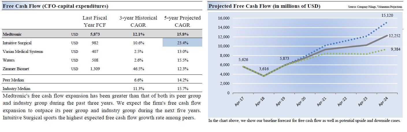 Intuitive Surgical does not currently pay out a dividend. Medtronic does, and shares of MDT yield 2.0% as of this writing. We recently raised our fair value estimate for MDT to $101 per share, with the top end of our fair value estimate range standing at $119 per share. As Medtronic trades near $106 per share as of this writing, shares seem fairly valued with room for modest upside if its entrance into the robot-assisted surgery device space works out favorably. As with Intuitive Surgical, we like Medtronic’s free cash flow growth prospects as you can see in the picture below. Strong free cash flows are responsible for Medtronic’s solid 2.1x Dividend Cushion ratio. To see more, check our Medtronic’s 16-page Stock Report here—->>>>