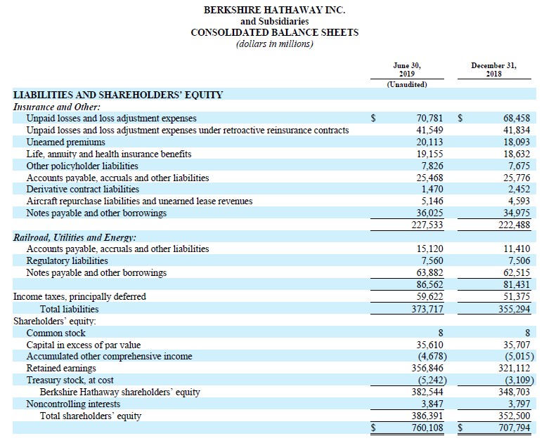 Image Shown: Berkshire Hathaway’s balance sheet can be a tricky read given its large insurance operations. Image Source: Berkshire Hathaway – Second quarter 2019 10-Q filing